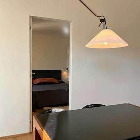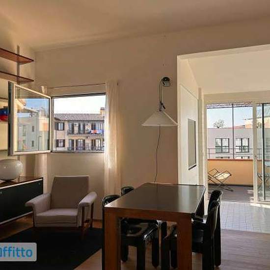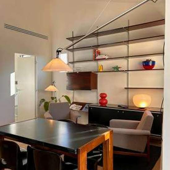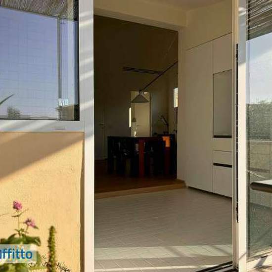 Bright and quiet newly renovated apartment on the third floor of a small and charming building without lift. The apartment overlooks the internal gardens and therefore enjoys silence and pleasant views. It is composed of a large living area with dining work table, armchairs and a large bookcase. The living room is connected to the new kitchen, fully equipped with oven, fridge and dishwasher. From the kitchen there is access via large glass windows to the terrace shaded by a pergola and furnished with table, chairs and armchair. There is also...