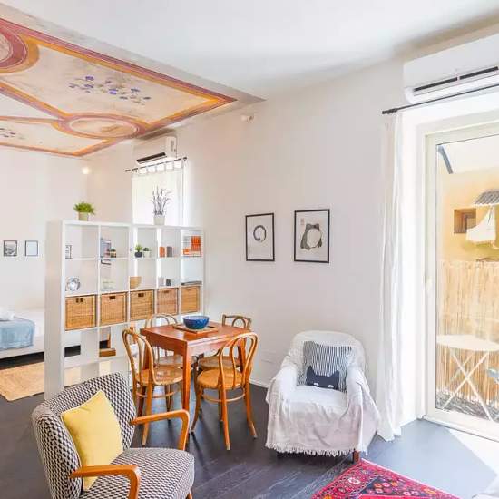 Beautiful apartment located in Via dei Campani, in the famous and colorful San Lorenzo district. This area is well served with restaurants, bars, shops and much more, famous for its nightlife and its proximity to the historic center and Termini station. The property is on the fourth floor without elevator, consisting of a large single room, living area composed of a table with chairs and large and comfortable sofa, fully equipped kitchen, sleeping area with double bed, a large bathroom with shower and a very comfortable walk-in closet, compl...