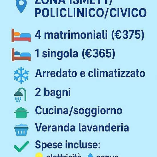Affitto Stanze in un ampio Appartamento – Zona ISMETT/Policlinico/Civico 5 camere: L’appartamento si trova in un contesto residenziale tranquillo, a pochi passi da ISMETT, Ospedale Policlinico e Civico. Caratteristiche principali: Climatizzatore caldo/freddo in tutte le stanze (compreso soggiorno) 2 bagni con doccia Cucina e soggiorno abitabili Veranda lavanderia Arredamento nuovo e moderno Tutti i comfort inclusi Servizi vicini: Supermercati Panificio Farmacia Palestra Cartoleria ecc... Prezzi: 4 Camere matrimoniali a...