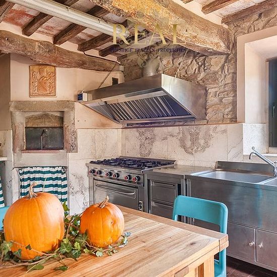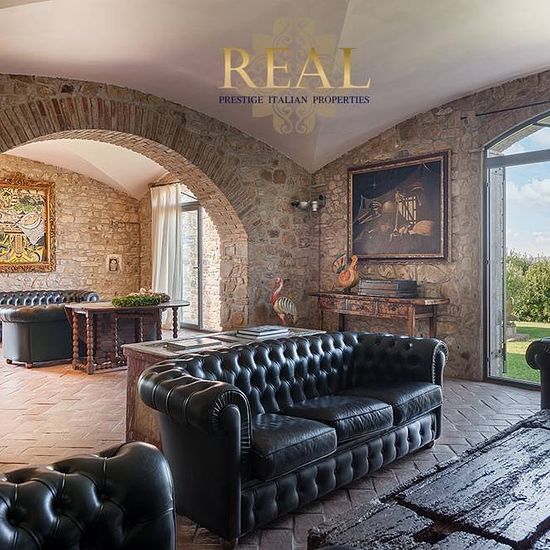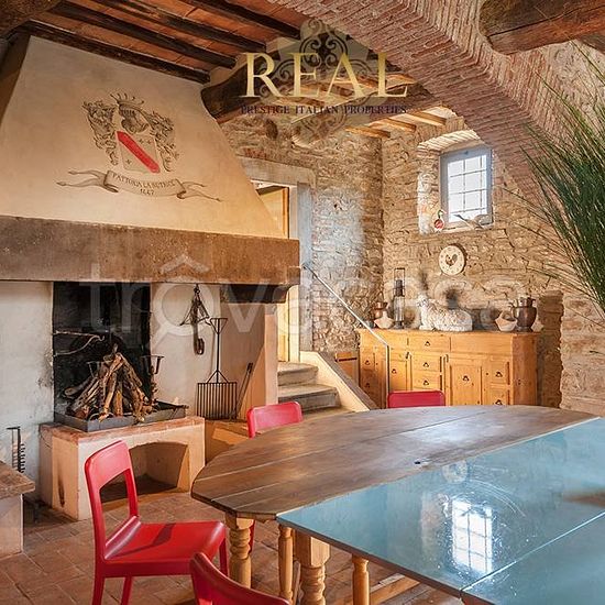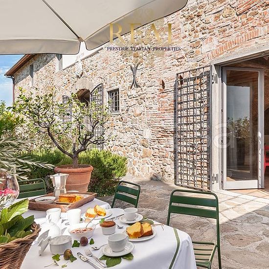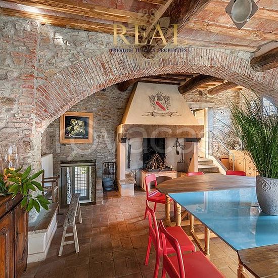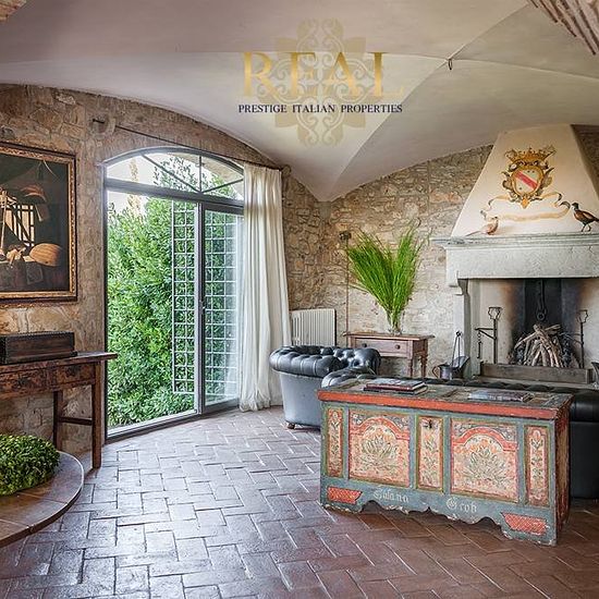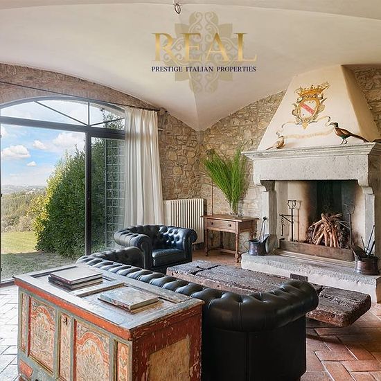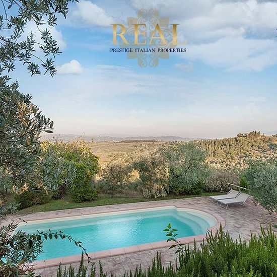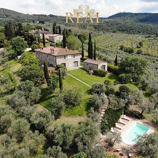 Firenze sud: La villa con vista panoramica sulla Firenze monumentale, si trova sulle colline a sud di Firenze, all'interno di una proprietà di 70 ettari di terreno tra boschi e uliveti. La villa dal tipico aspetto medioevale è tutta in pietra, bagni in marmo travertino, pavimenti in cotto. Situato a soli 15 minuti di auto dal centro di Firenze. Villa principale - Piano terra: Ingresso, 2 soggiorni con camino, sala lettura, cucina professionale, sala da pranzo con camino, taverna, camera senza barriere architettoniche con bagno privato, wc di...