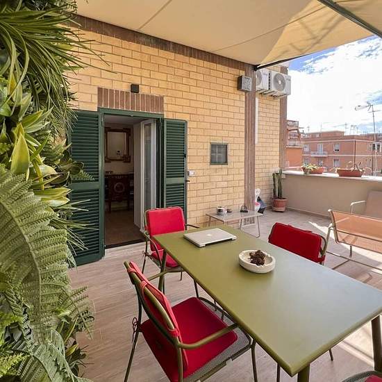 Splendido attico con terrazza completamente ristrutturato, bilocale composto da ingresso soggiorno con divano letto e cucina a vista attrezzata, camera matrimoniale, ripostiglio con zona lavanderia, bagno con box doccia, terrazza e balcone. Tripla esposizione, silenzioso e luminoso. Completamente arredato,(tutto nuovo) con smart tv, wifi, climatizzatore e termoautonomo. Ottima posizione, a pochi metri dalla Metro a Cornelia, nella zona più commerciale di via boccea. Terzo piano no ascensore. *Disponibile esclusivamente per locazione breve e ...