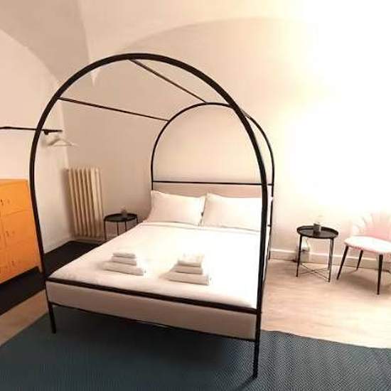 Splendido appartamento con soffitto a volte, piano seminterrato ma luminoso, con piccolo terrazzino privato, cucina completamente attrezzata e frigorifero di design, due ampie camere da letto, grande soggiorno. Bagno piccolo ma comprensivo di ogni comfort (no bidet, ma doccino). Possibilità di doppio ingresso indipendente. L'appartamento verrà affittato compreso di letti matrimoniali di design, armadi, frigorifero e attrezzi della cucina (nuovi), lavatrice, forno, divano (identico a quello della foto ma senza L). Quartiere alla moda, ricco d...