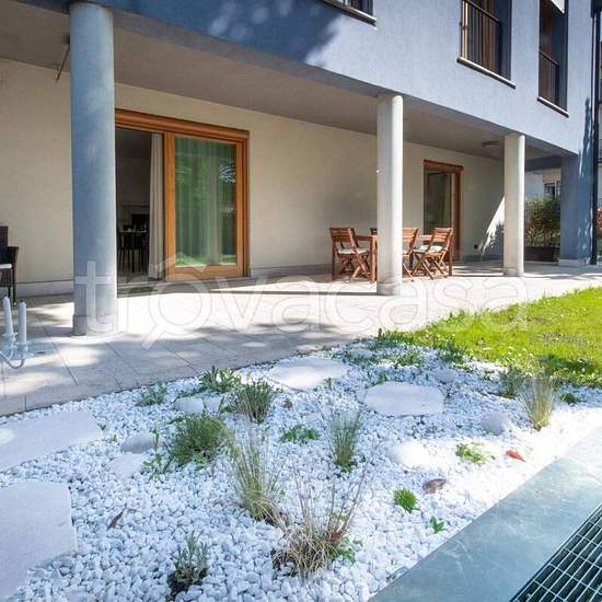 Affitti transitori. Splendido appartamento dotato di un ampio e luminoso soggiorno su cui affaccia il moderno e luccicante angolo cottura e da cui si accede al portico e giardino privato. L'appartamento dispone di una camera matrimoniale con ampio armadio e di un comodo divano letto matrimoniale. La libreria che arreda il soggiorno è dotata di un angolo scrivania per lavorare. Il disimpegno armadiato porta al bagno finestrato e alla camera da letto matrimoniale anch'essa con accesso diretto al giardino a alla lavanderia con lavatrice, lavato...