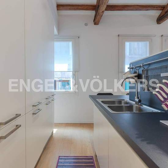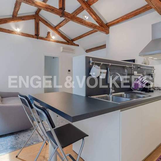 A pochi minuti a piedi dal famoso Ponte di Rialto, ci allontaniamo dalla vivace calle piena di negozi e servizi e andiamo in un angolo più tranquillo della città. Salendo al terzo piano, arriviamo all’appartamento — uno spazio luminoso e accogliente che ci fa subito sentire a casa. Appena entrati, la luce naturale filtra dalle finestre e illumina il soggiorno open space. Un comodo divano ci invita a rilassarci, mentre tocchi di colore sui tavolini aggiungono calore e personalità all’ambiente. Dietro un basso muretto divisorio, notiamo la cuc...