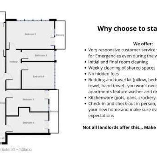 The apartment Conveniently located on the sixth floor in Via Beatrice deste 30, walking distance to Bocconi University, ied Pompeo Leoni and Navigli. The area offers plenty of options for cafes, restaurants, bars, supermarkets and bookstores. Perfectly connected thanks to the metro line mm3 and tram. Internal conditions we invested in a full renovation and restyling of the flat. There are six rooms, two bathrooms, an eat-in kitchen with dishwasher, washing machine, shared dining area, wifi and air conditioning. Shared kitchen equipment provi...