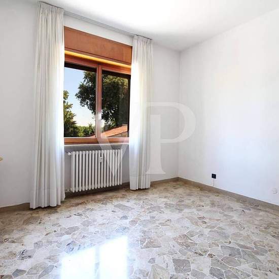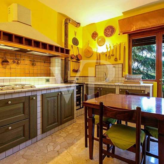 Large apartment on one level, on the first floor, within a residential context consisting of a few units surrounded by greenery a stone's throw from the city. The proposed solution consists of entrance, separated studio, large living room with separate and habitable size kitchen, fully furnished in masonry and equipped with a wood-burning "economic kitchen". From the kitchen there is a terrace that runs along the entire front of the apartment and overlooks a beautiful garden with tall trees. In the living room there is a billiard table, whic...