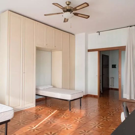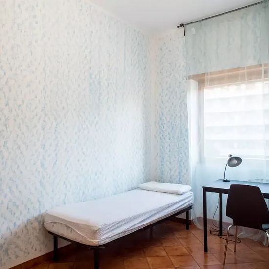 Bedroom 2 is a spacious room with a single bed and a separate sofa bed. There is also a desk, a chest of drawers with shelving, and a large wardrobe. The room has tiled floors, helping it to keep cool in the summer months, and there is a view of the street from the window. ![youtube zMpe2iVN2xg] Rooms are available to rent in a large, 110 m², 3-bedroom apartment with a balcony situated in Rome's Cinecittà neighbourhood. The interior of this property is exceptionally spacious and bright, and all rooms are very sizeable. The large kitchen is f...