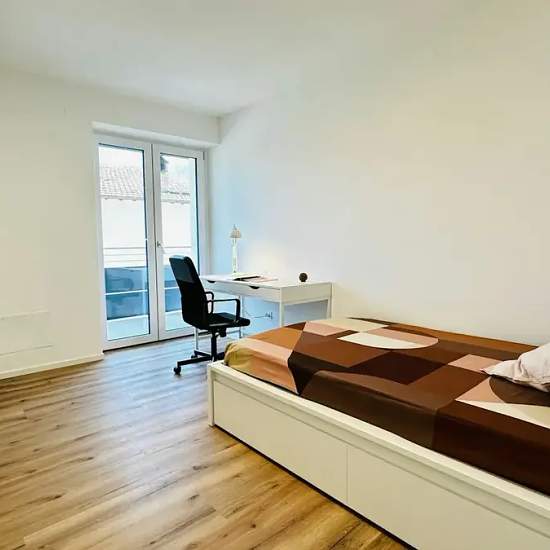 A modern and bright single room: furnished with a queen-size bed, a spacious desk with an ergonomic chair, and a study lamp, ideal for concentrating. Equipped with a three-door wardrobe and vertical bookcase to keep everything in order. Parquet floors and a large window with access to the balcony make the room warm and welcoming. Minimal and functional design, perfect for those seeking comfort and practicality in studying and relaxing. Halfway between the historic center and Mesiano, this apartment is the perfect meeting point for studying a...