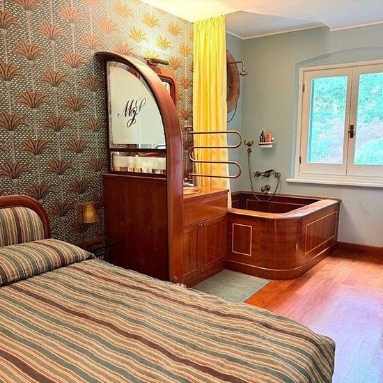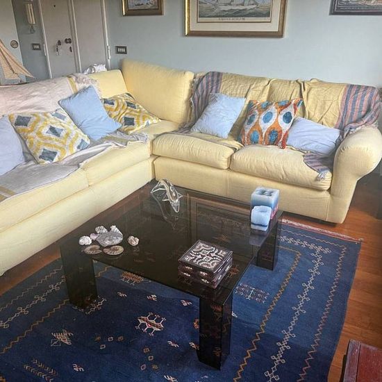 E' un delizioso appartamento pieno di fascino quello che vi proponiamo in locazione temporanea, situato in posizione centralissima 'in prima fila' come si usa dire qui, cioè a due passi dal mare. in un palazzo d'epoca ma dotato di ascensore (che è una rarità ), una superficie di circa 70 mq mirabilmente concepita e razionalmente suddivisa: una zona living con soffitto a cassettoni affrescato, cucina a vista, una camera con letto matrimoniale e vasca da bagno in legno, un'altra camera con un divano letto a due posti, e un bagno tutto in legno...